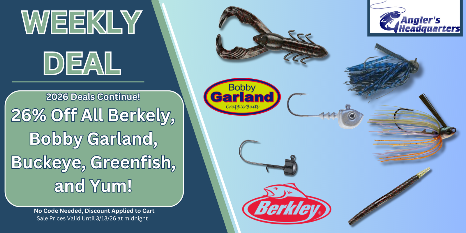 2026 Deals Continue! 26% Off All Bobby Garland, Berkley, Buckeye, Greenfish, and Yum!