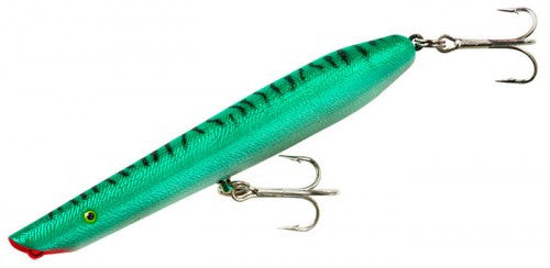 Sometimes you need a whisper, and other times a shout! When it takes loud surface disturbance and a big honking topwater to catch trophy bass, stripers, redfish and other tough gamefish, reach for a Cotton Cordell Pencil Popper. It walks-the-dog on top, but with its concave mouth, also catches and throws lots of water for tremendous surface disturbance. These big 6- and 7-inch lures are known for catching big fish, and the weighted tail aids in casting distance and accuracy, as well as adding more erratic action.